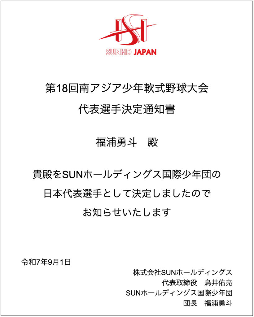 U15 福浦勇斗(大阪桐蔭高校→桐蔭横浜大学→SUNHDEast)
